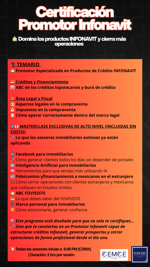 👉🚀 “Certifícate como Promotor INFONAVIT y acompaña a tus clientes en el sueño más importante de su vida: su casa.”